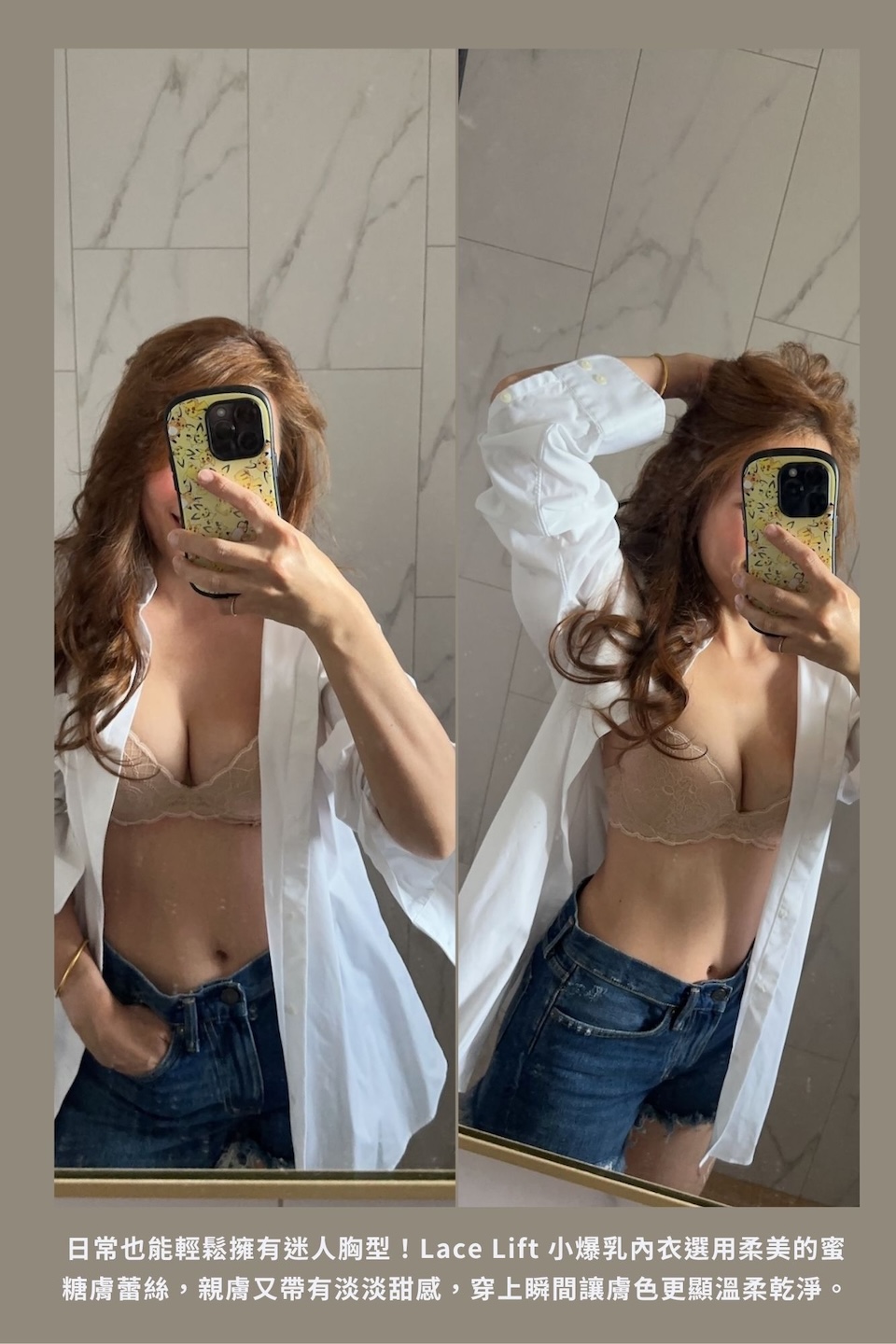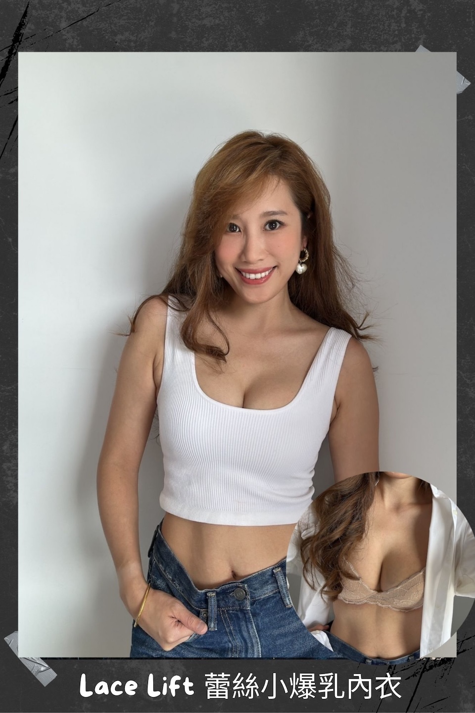 換上 Lace Push Up 蕾絲小爆乳內衣後,胸型立刻被溫柔托高、自然往中線集中,整體曲線變得澎潤又飽滿。