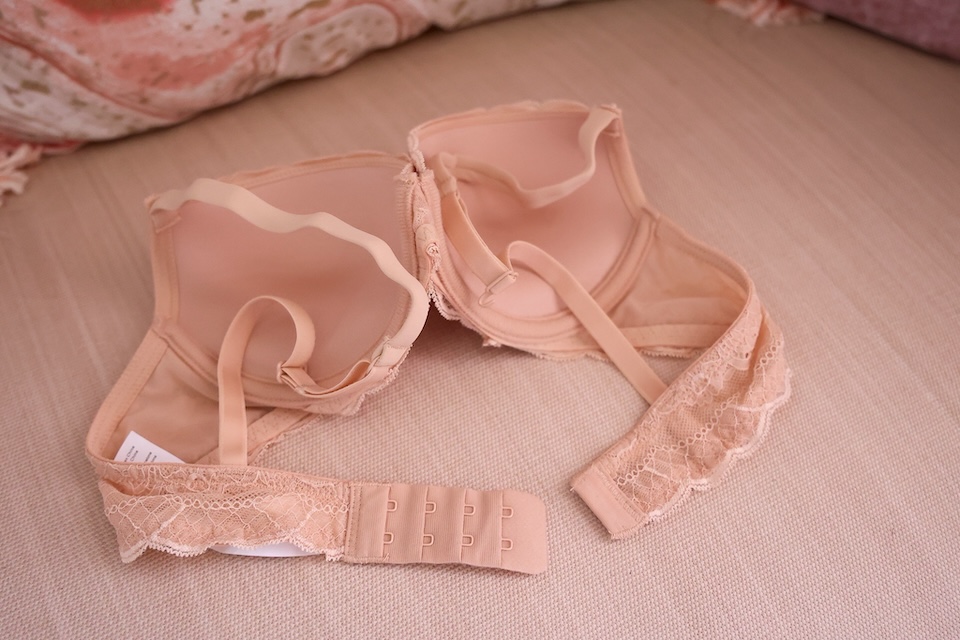 襯墊下厚上薄設計,厚度約 2.5 公分,集中托高胸型,視覺放大一個罩杯,讓鎖骨線和上胸飽滿的曲線完美展現。