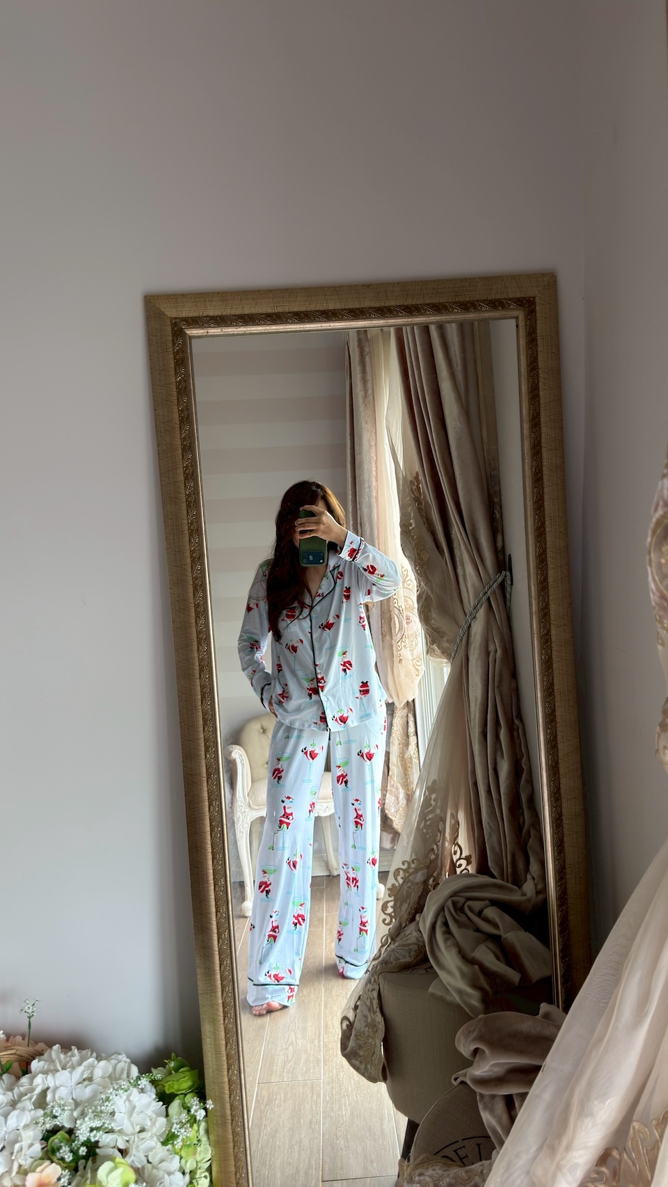 高腳杯微醺聖誕老人超可愛,搭配輕奢藍白雪景底色,讓家裡立刻充滿節慶氣氛。布料柔軟到像抹奶油,一穿整個人都融化。