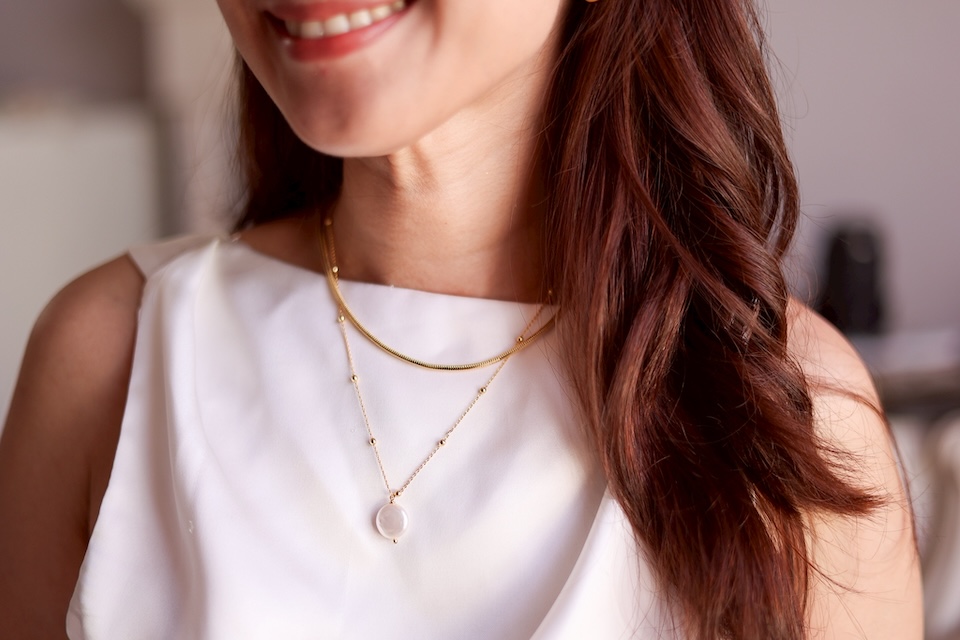 這款 Pearl Veil 是我們這次輕珠寶選品中的唯一的項鍊,不需要思考如何疊搭,一扣上就能呈現出層次美感。下方墜著一顆溫潤的天然淡水珍珠,在妳舉手投足間輕輕晃動,散發出一種非常顯白的柔焦光澤。我們很喜歡它垂落在鎖骨處的精緻感,搭配低領或是寬鬆的毛衣,會有一種很不經意的、帶著溫度的微性感。這是一款能讓妳在日常中,瞬間變得精緻動人的靈魂單品。