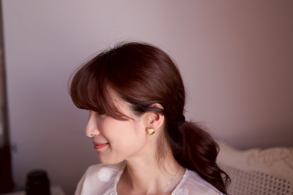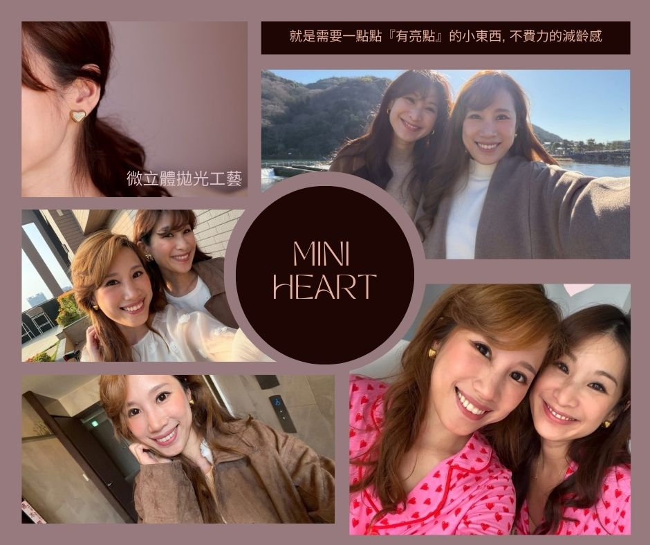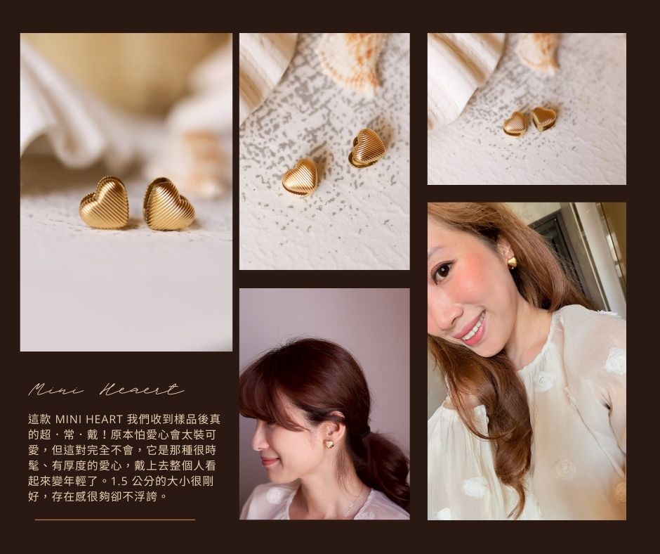 這款 Mini Heart 真的讓我們愛不釋手!這兩個月來,我們幾乎天天都離不開它。它的魅力在於那種「剛剛好」的大小——1.5 公分的微立體設計,在耳垂上顯得精緻且有造型感,完全不覺得幼稚,反而讓整體造型瞬間變得很年輕、很有朝氣。線條面金屬的處理非常細緻,無論是隨意紮起馬尾,還是搭配日常的休閒穿搭,就是那種不費力的減齡感。戴上它的瞬間,感覺心情都輕盈了起來。