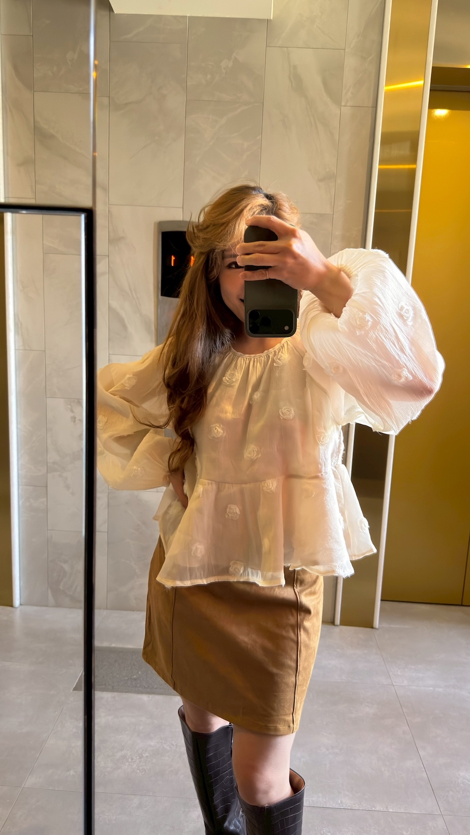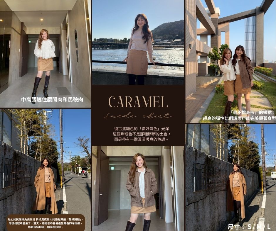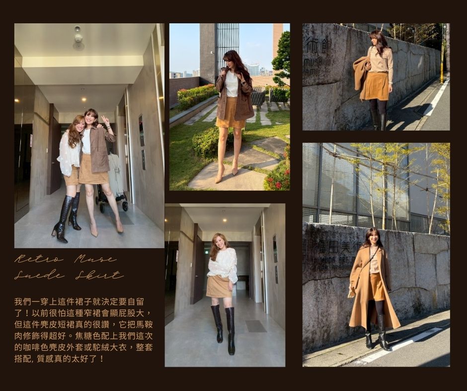 這款裙子真的是我們試穿後覺得一定要自留的裙子!很多時候想穿短裙又怕太短覺得害羞,或者太合身覺得束縛感太重,但這件 Retro Muse 焦糖短裙真的不一樣。這款麂皮面料裡藏了 10% 的彈性纖維,摸起來有種像水蜜桃皮那種霧霧軟軟的觸感,穿上去後的包覆感合身但不緊身. 貼合卻完全不勒肚子。 復古的焦糖色調非常有法式氛圍,那種優雅又帶點小個性的感覺,隨便配個白襯衫或我們這次推出的Cashmere毛衣就美瘋了。非常百搭!!最讓我們滿意的是它的版型,它不是那種會讓妳下半身顯壯或者矮矮的 A 字裙,而是經過精準修飾、能讓腿部線條看起來最修長的黃金比例。不管是搭長靴還是樂福鞋,這件裙子都能讓妳在日常中優雅得很有質感。