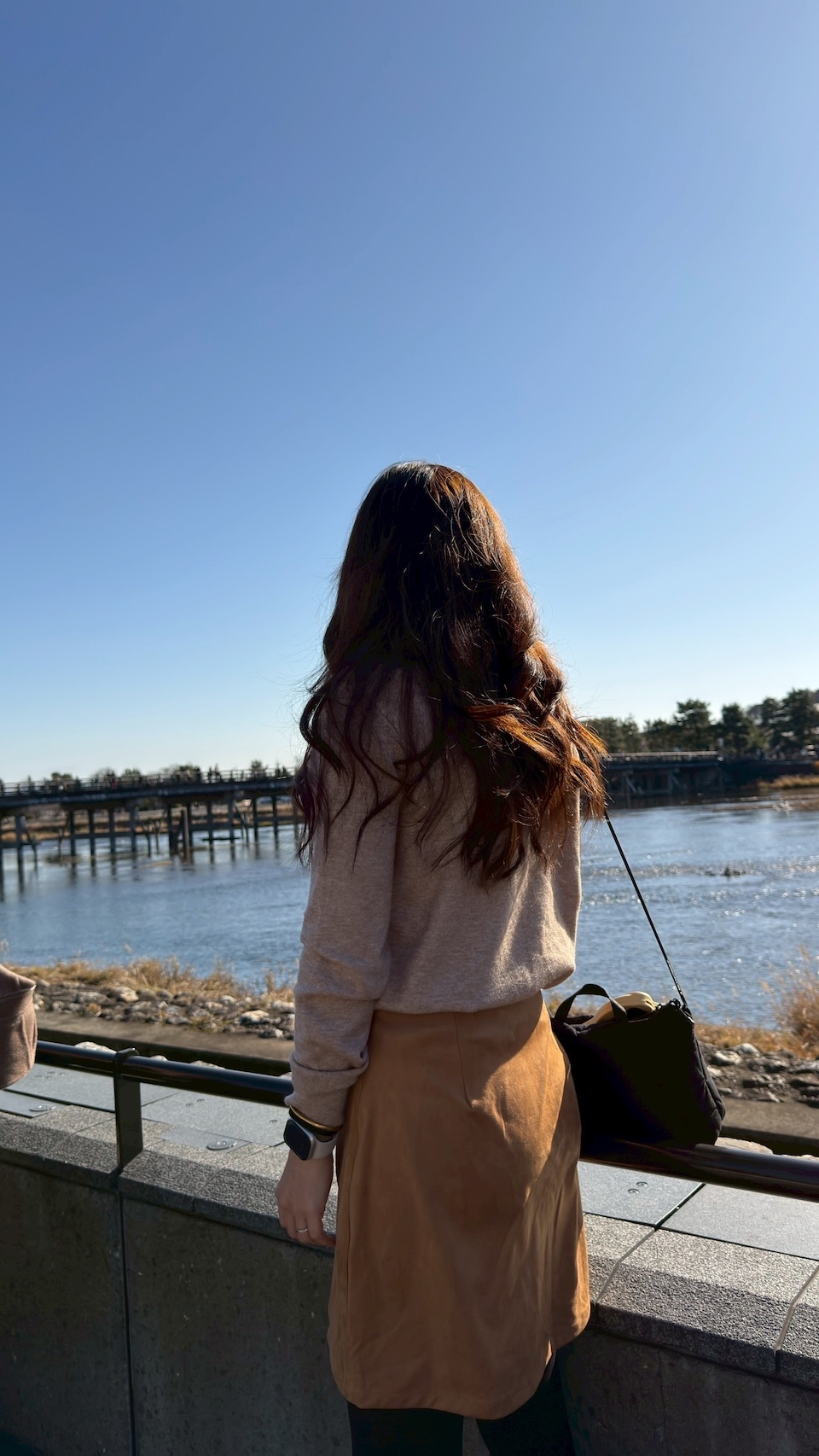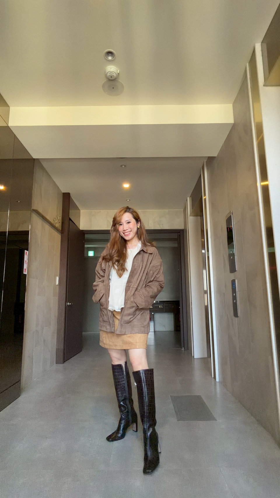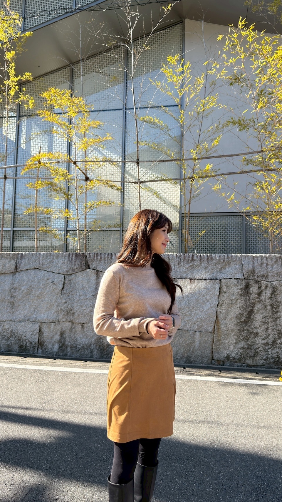 復古焦糖色的「顯好氣色」光澤 這個焦糖色不是那種髒髒的土色,而是帶有一點溫潤暖意的色調。在光影下會透出麂皮特有的細膩霧光,配上簡潔的剪裁,讓這件短裙帶有法式風格的那種高級感。