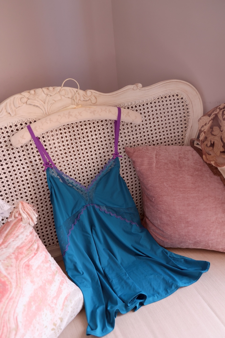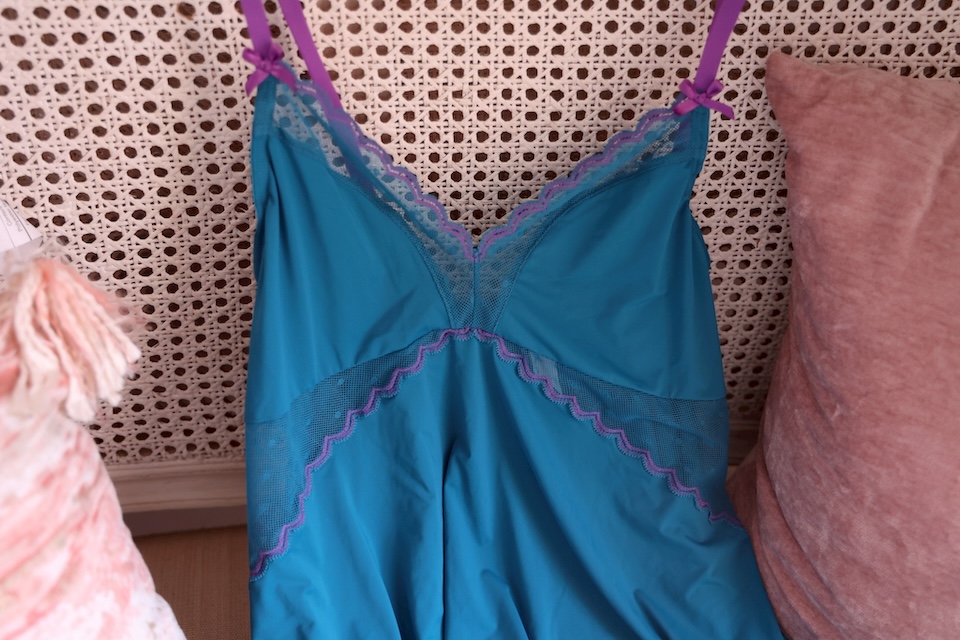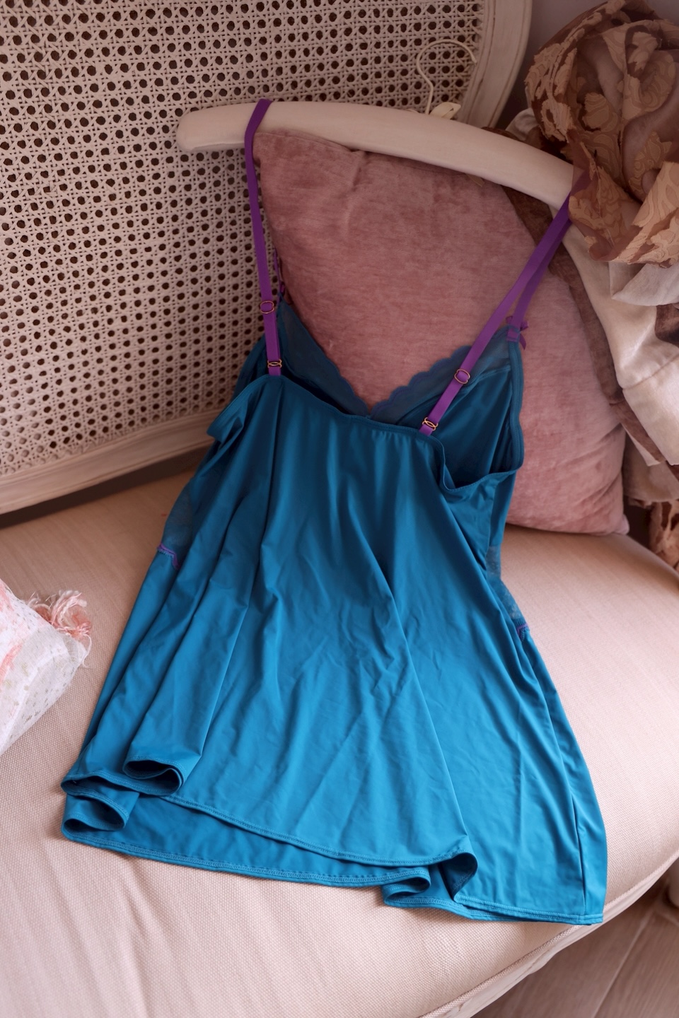 Teal Green 孔雀綠配上撞色的紫色細肩帶層次感拉滿,穿上去膚色直接亮三階!它是那種很經典的 Baby Doll 剪裁,下襬帶點微寬鬆的傘狀,不但能遮肚肚,走路時那種飄逸感真的太迷人。