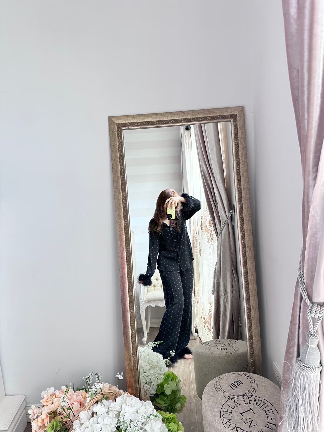 黑色柔緞面料,上面帶著若隱若現的微亮星空點點,光澤感極好,穿上去整個人顯得非常貴氣。最驚艷的是袖口跟褲腳那圈豐盈羽毛,極致奢華的設計,穿起來有一種靈動感,不只高級、同時兼具迷人的女人味。