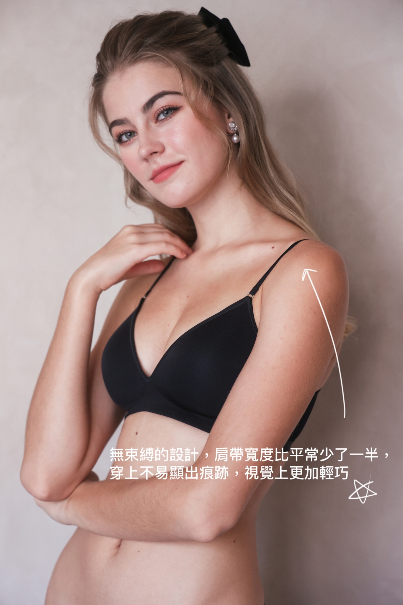 穿黑色內衣露出細細的肩帶跟穿內搭一樣, 完全不露餡!