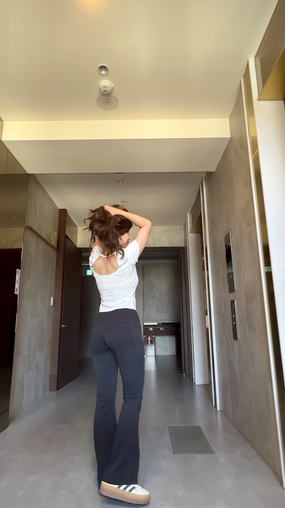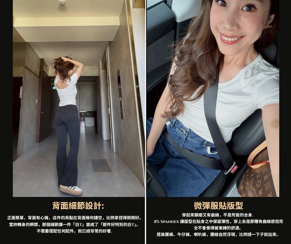 這件背面有一個精緻的幾何鏤空開口,是一個讓妳轉身的時候,讓人想再多看一眼的小心機和有記憶點設計。搭牛仔寬褲出門,搭喇叭褲也好,都非常好看。