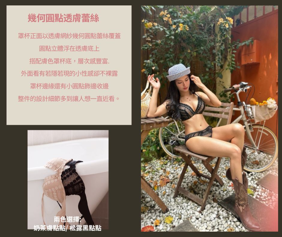 這款【微醺小心機】採用的點點網紗(Polka Dot),配上若隱若現的幾何曲線,視覺上呈現出一種高級的透膚心機感。