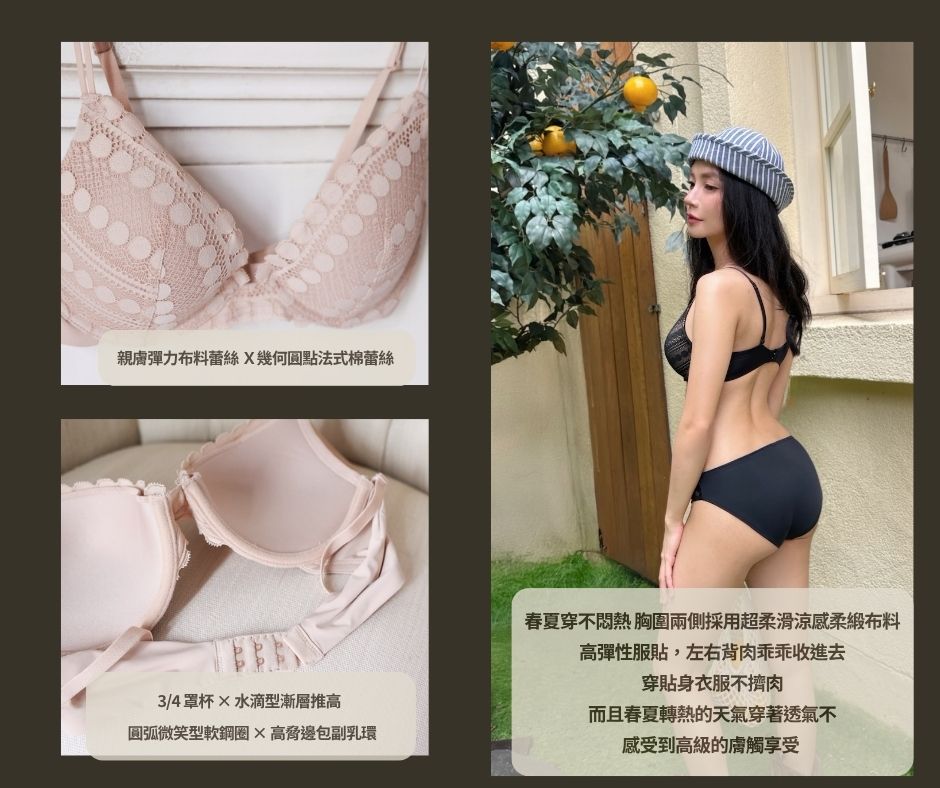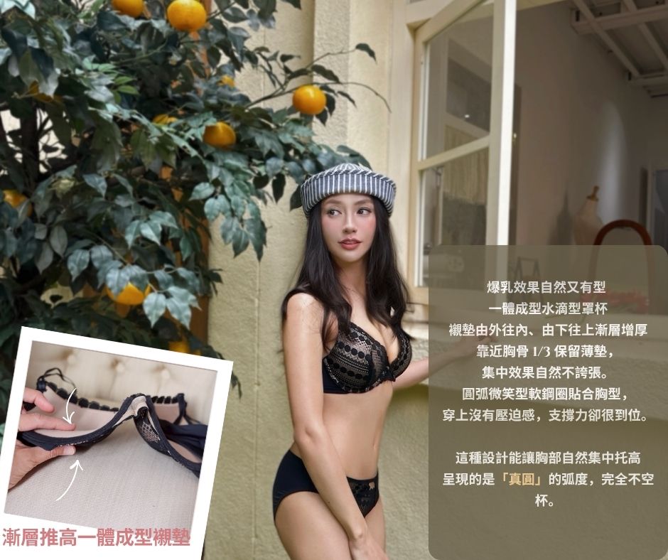 最讓人驚艷的是它的 「3/4 罩水滴型」 剪裁與漸進式一體成型襯墊。