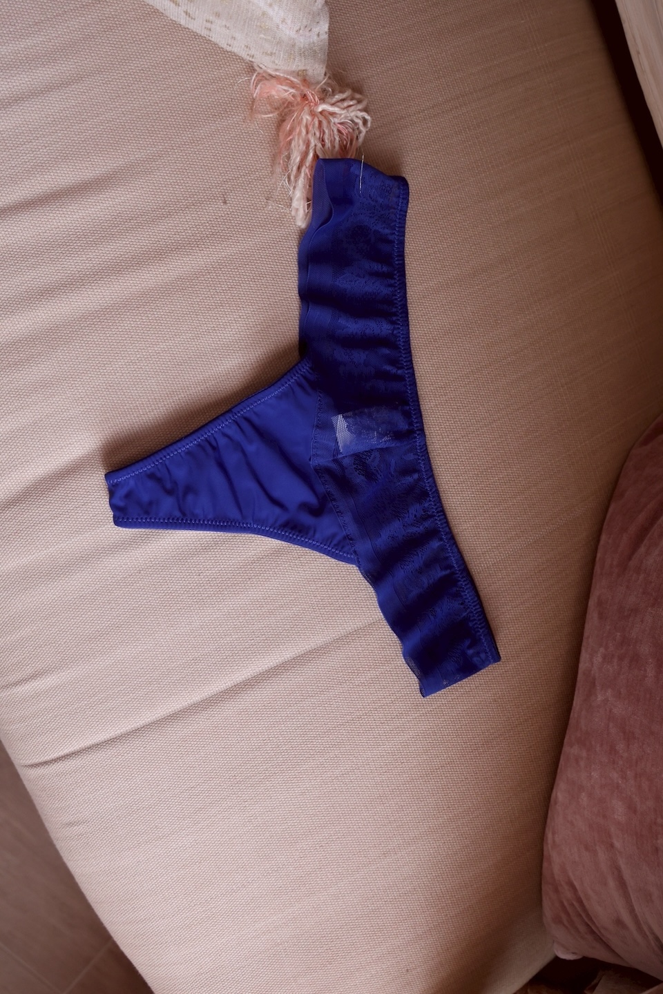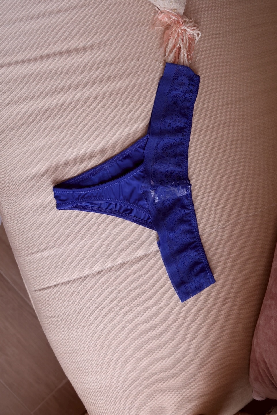 丁字褲是低腰設計結合透氣網紗蕾絲材質,柔軟親膚