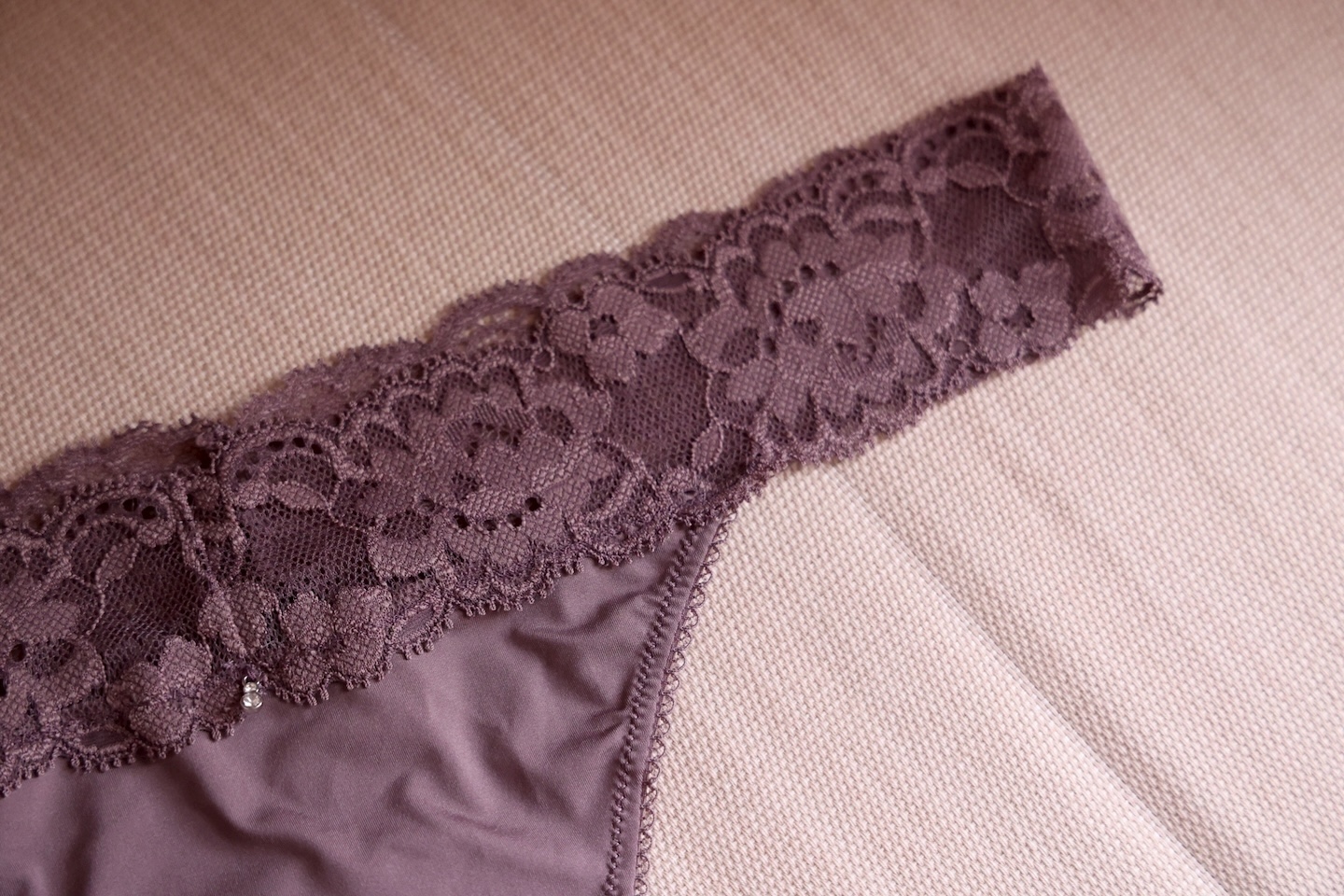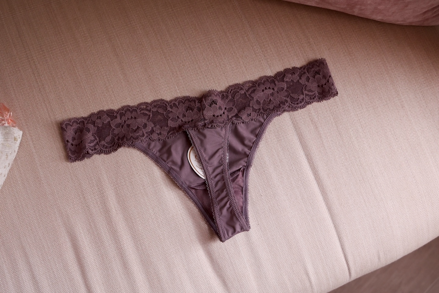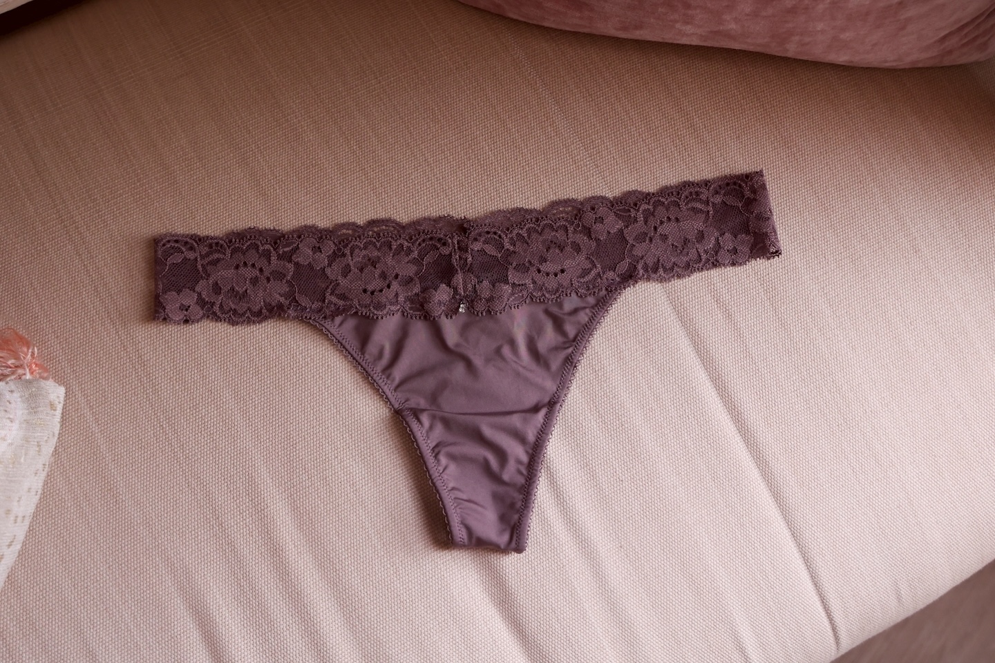 每日必備的丁字褲. 這款浪漫感的花卉蕾絲柔緞丁字褲是貼身穿搭時的必備品.. 不卡臀的溫柔貼合設計, 上身時展現性感魅力. 柔滑的蕾絲輕撫在腰間, 正面以高質感微光澤的柔緞打造. 穿上瞬間擁有迷人的身形曲線. 搭配同系列的Subtle Boost小爆乳內衣和 Cocoa Mist 無痕無鋼圈內衣, 是一組散發出性感魅力的噴火組合!!!
