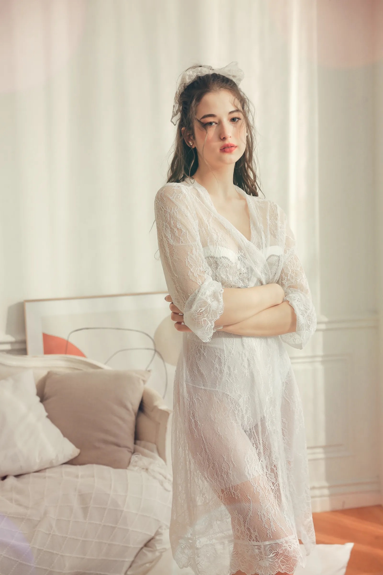 神秘感的全透膚蕾絲,那個花紋細膩到像是直接在肌膚上作畫。這件睡袍的剪裁非常精緻,隨意繫上腰帶,垂墜感跟走動時若隱若現的曲線,真的非常有質感。