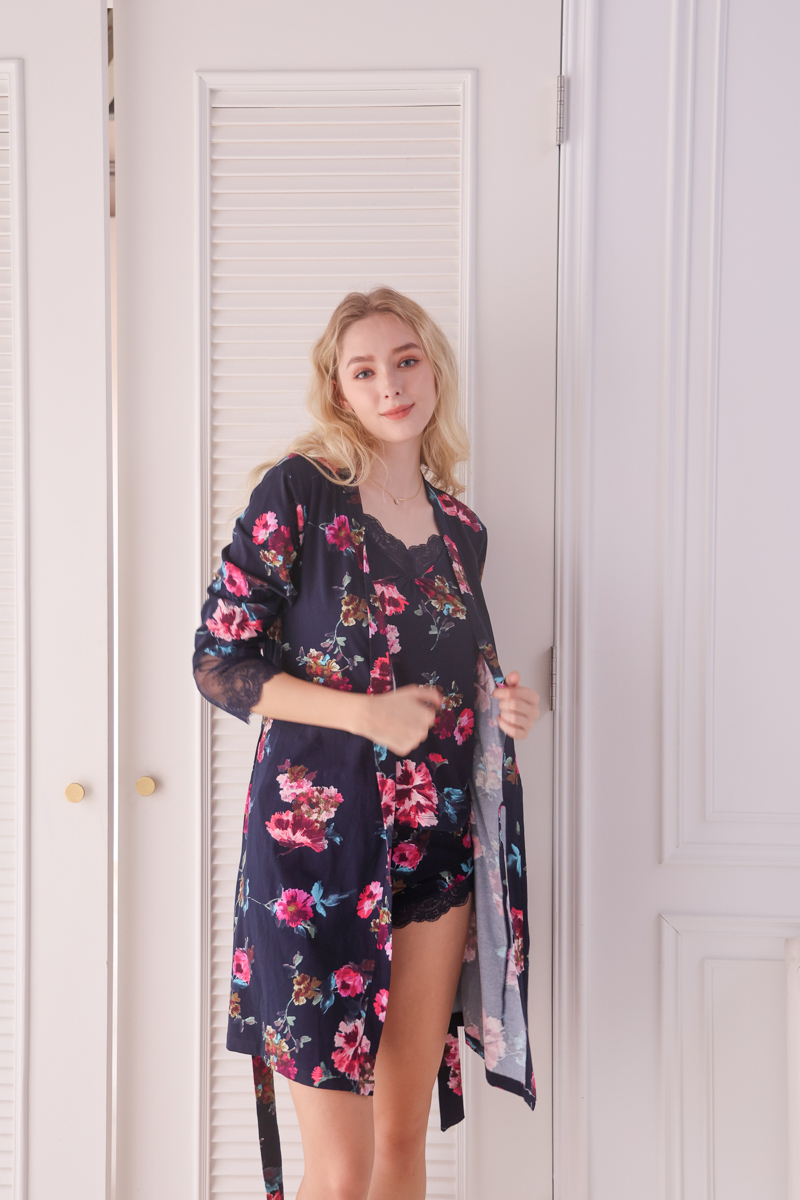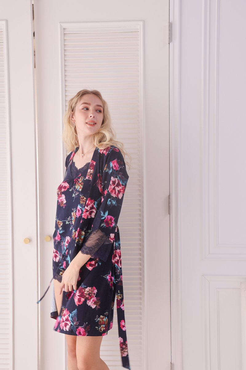 睡袍領口延伸整件與袖口處花卉蕾絲飾邊與細肩帶睡衣裙設計相呼應