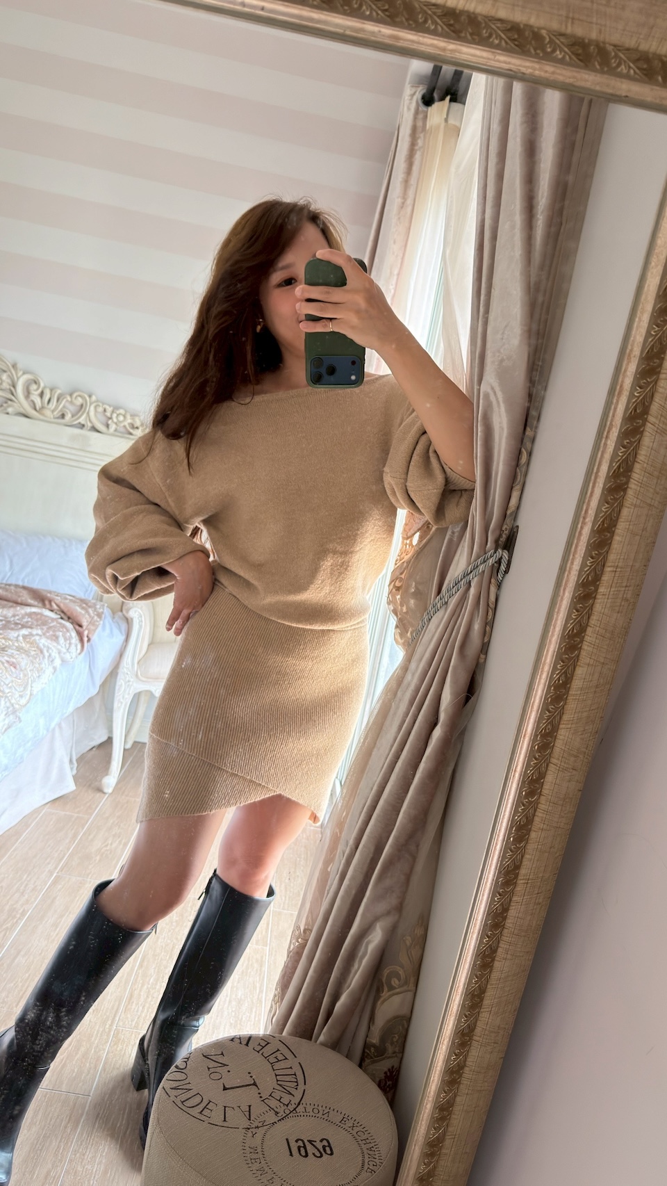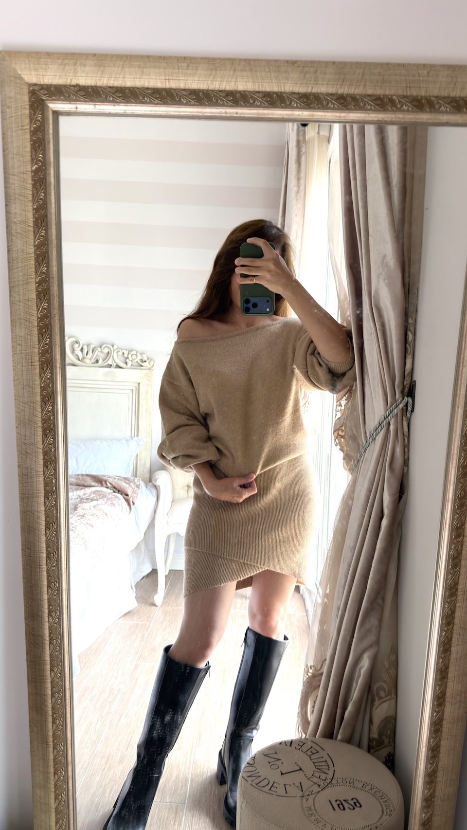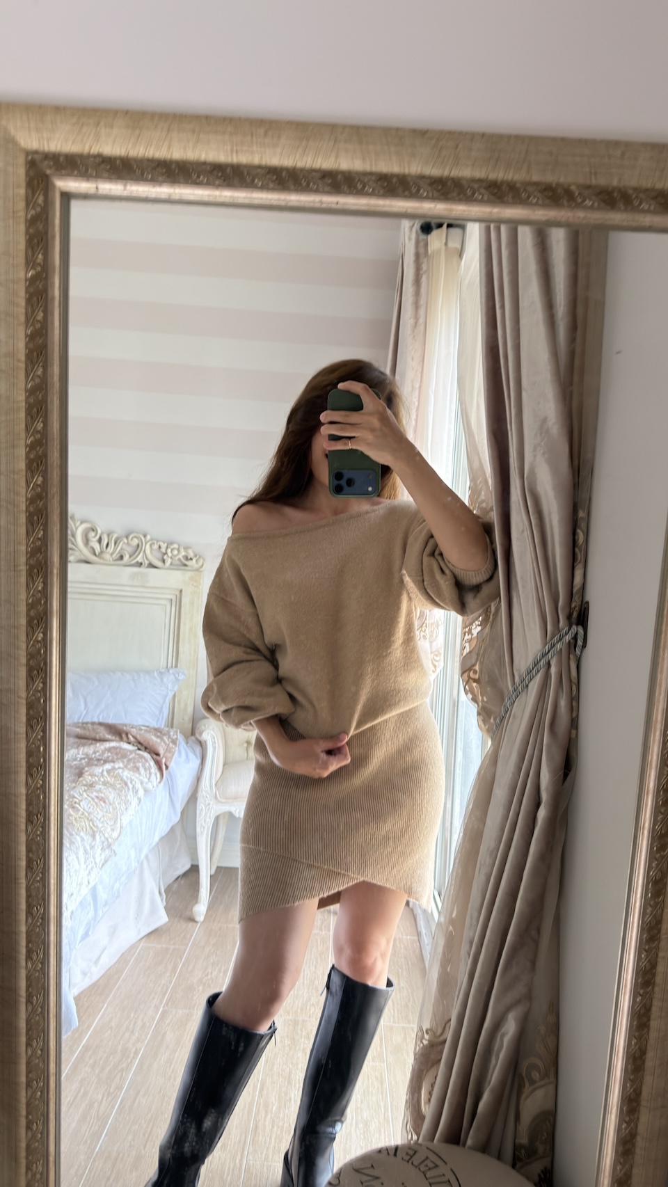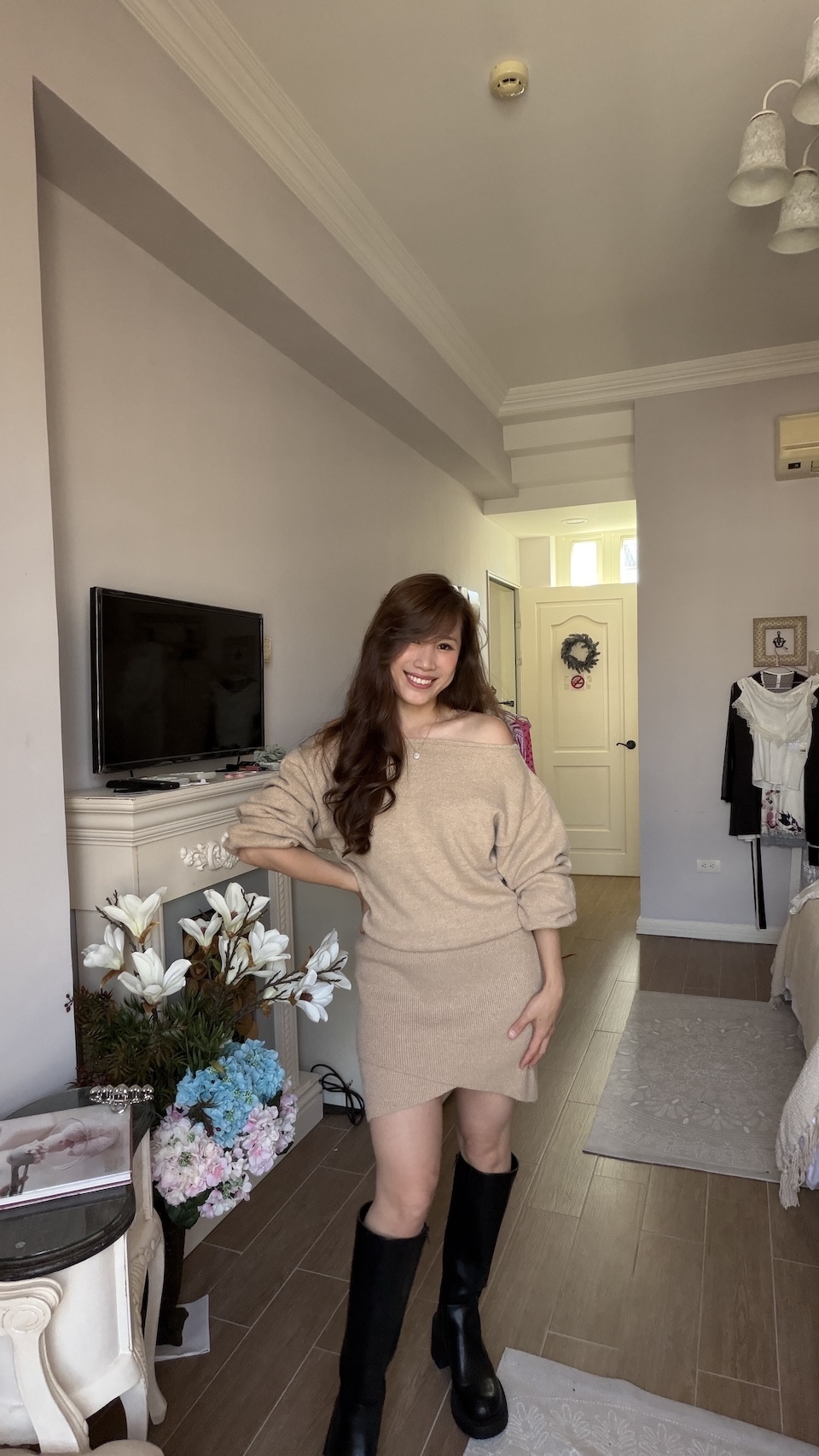像焦糖拿鐵一樣柔軟慵懶的斜肩洋裝,