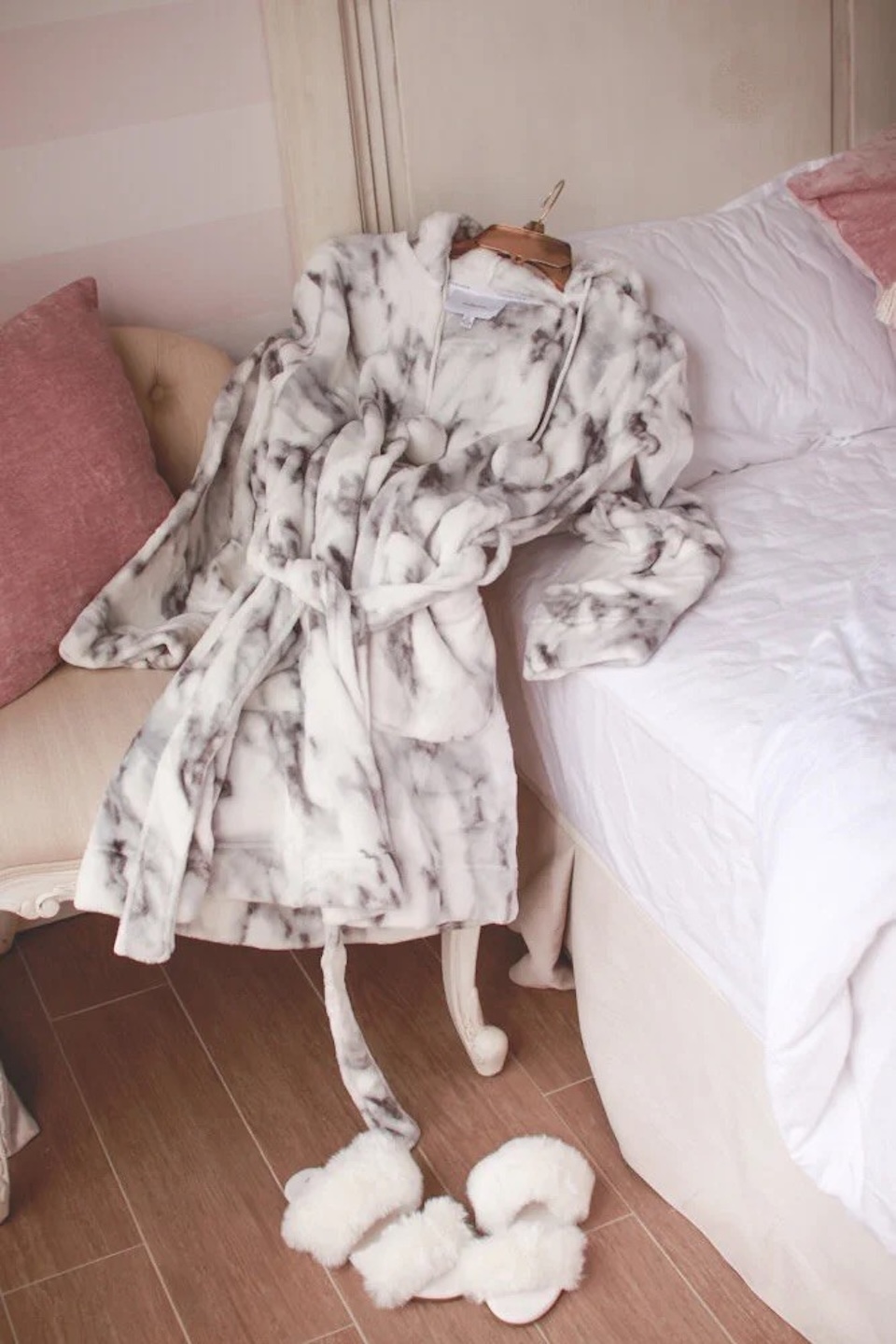 大理石纹路在睡袍中看起來更有質感,比起一般的純色款,它更能襯托出保有活潑又貴氣的氛圍。無論是早晨起床穿著它沖杯咖啡,還是洗完澡後裹著保養肌膚,都能讓我們在寒冷中保有那份不費力的時髦與優雅。
